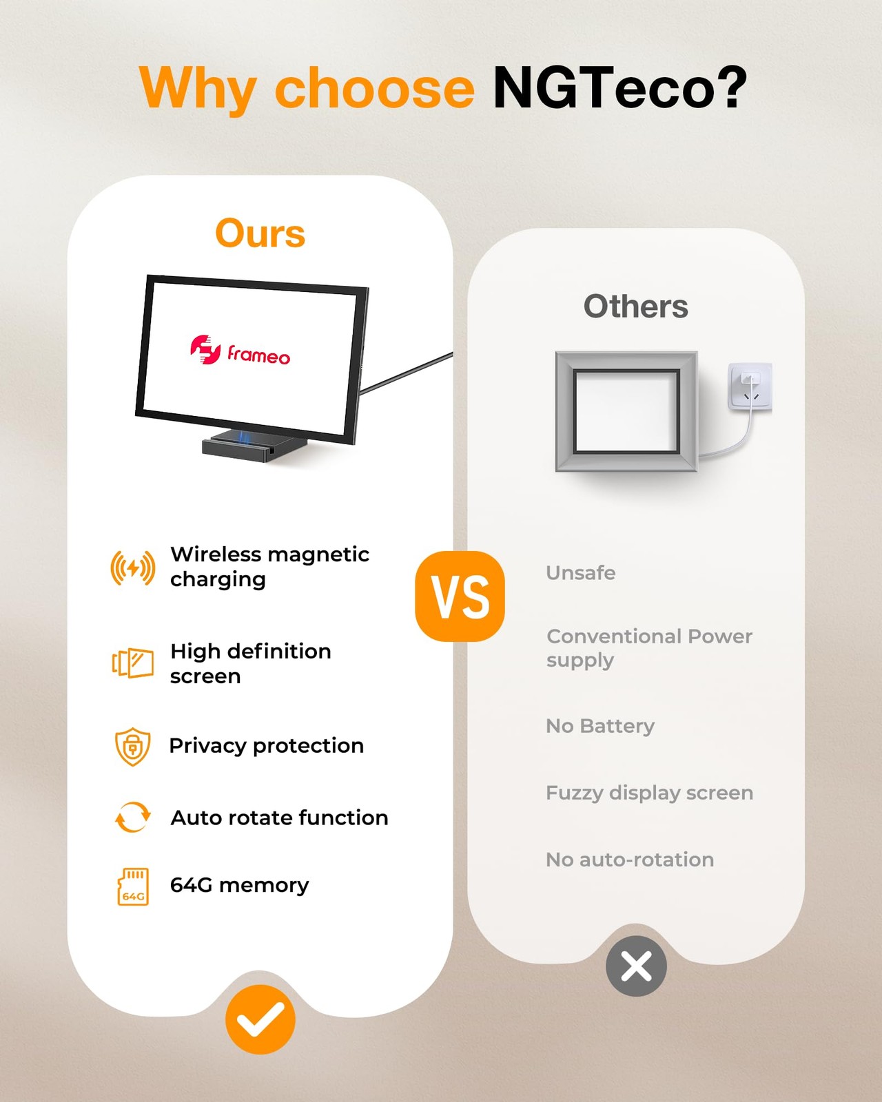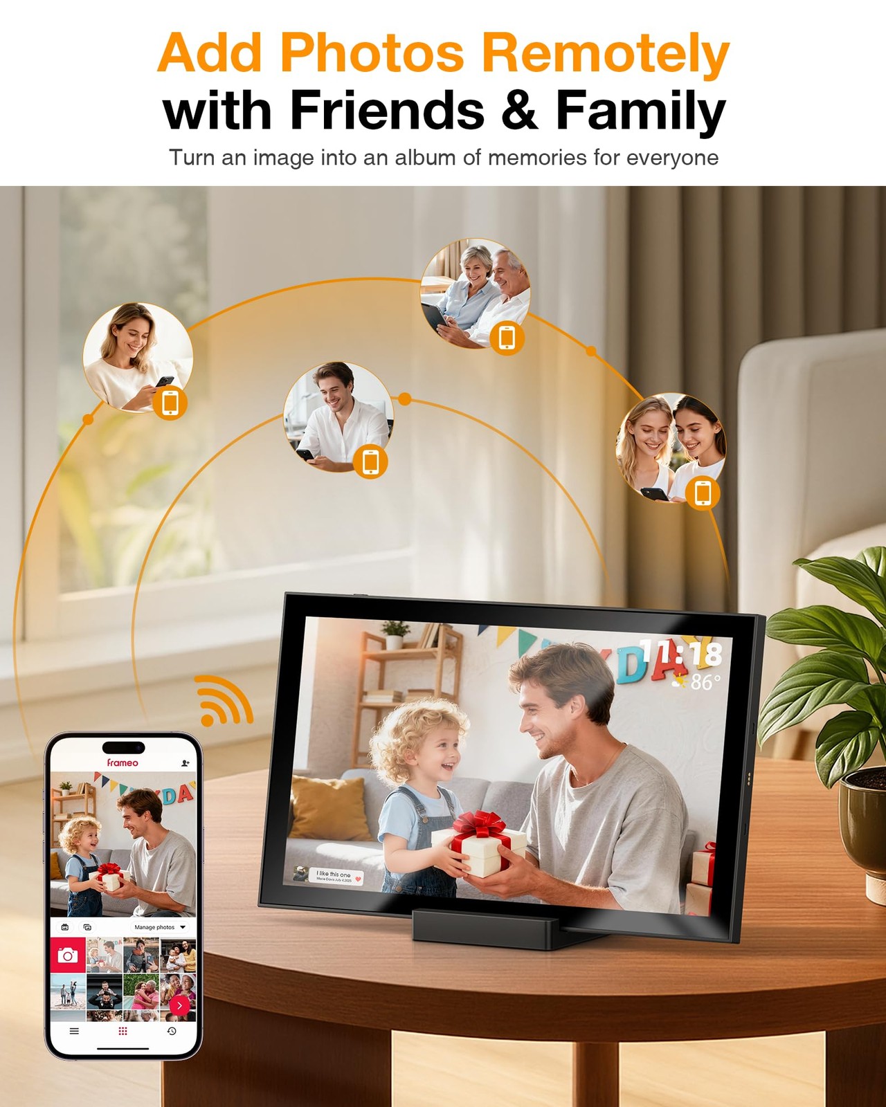 WiFi, FRAMEO app, Auto-Rotate, Brightness Control