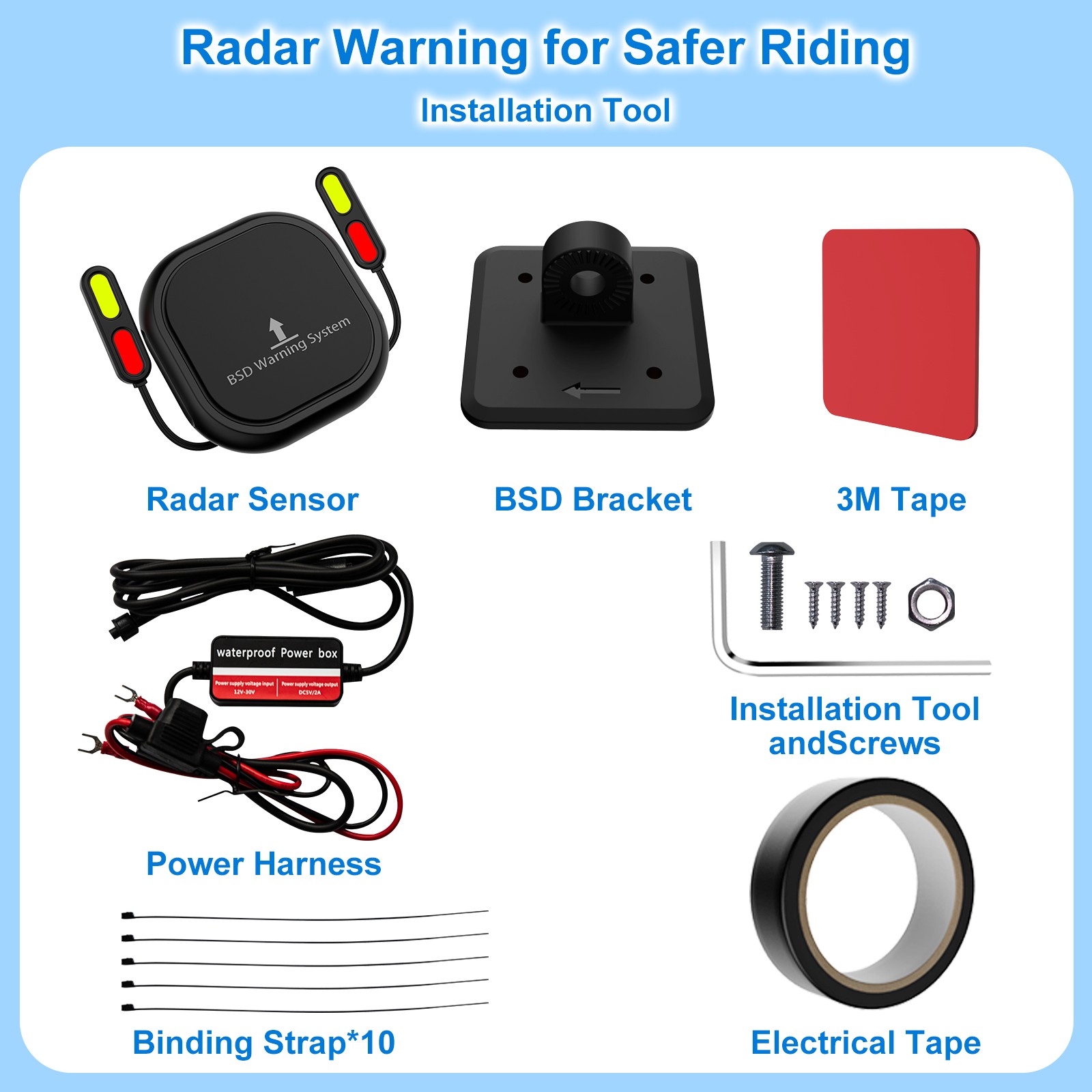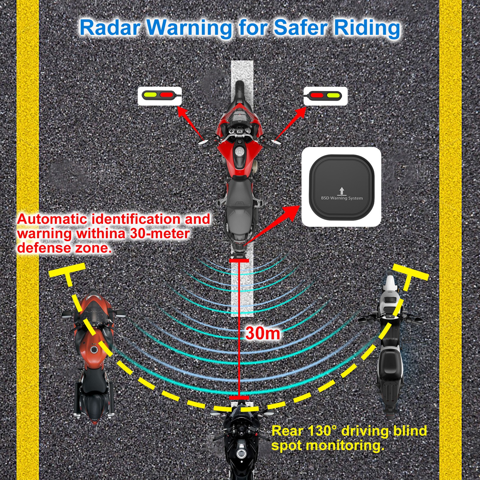 【Enhanced Radar Detector Assists with Safer Cycling 】The BSD01 radar detector motorcycle provides comprehensive 360° protection by simultaneously monitoring vehicles approaching from three directions - behind, left, and right sides.